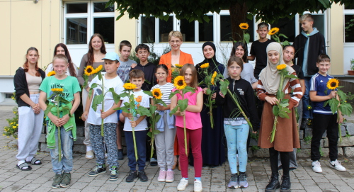 überreichte eine Sonnenblume als Gruß von seinen Mitschülern. Auch die jüngeren Schüler und die Kinder der Schulvorbereitenden Einrichtung kennen „ihre Schulleiterin“ bestens, hatte Wilma Brunner